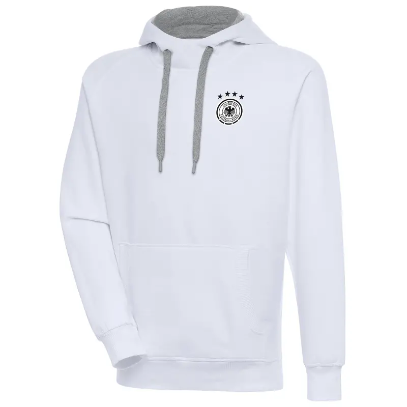 The Men's White Germany National Team Takeover Pullover Hoodie is the ultimate way to show unwavering support for the Germany National Team. This midweight hoodie, perfect for moderate temperatures, features embroidered graphics that proudly display the team's crest. The front pouch pocket provides convenient storage, while the rib-knit hem and cuffs ensure a comfortable fit. Whether cheering from the stands or showcasing team spirit, this hoodie is a must-have for any Germany National Team fan.
